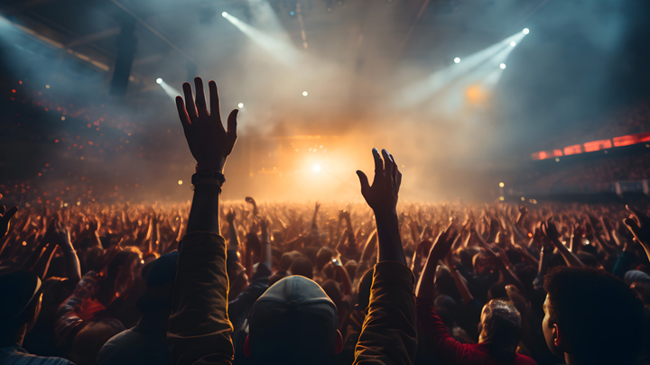 Name der Datei: Concert crowd with colorful stage lights and confetti