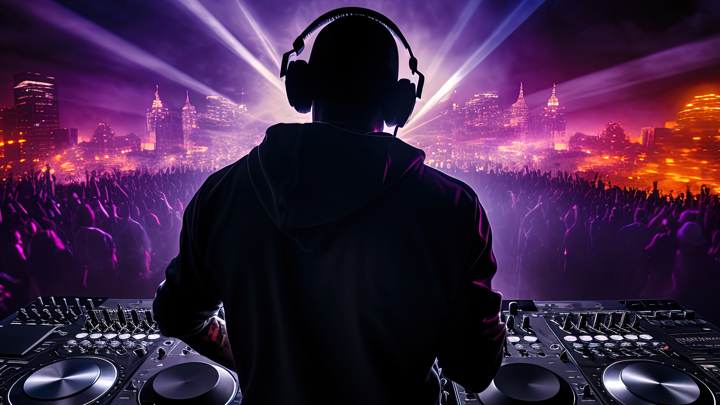 Name der Datei: Night club DJ wearing headphones under party lights showcasing the nightout theme. silhouette concept