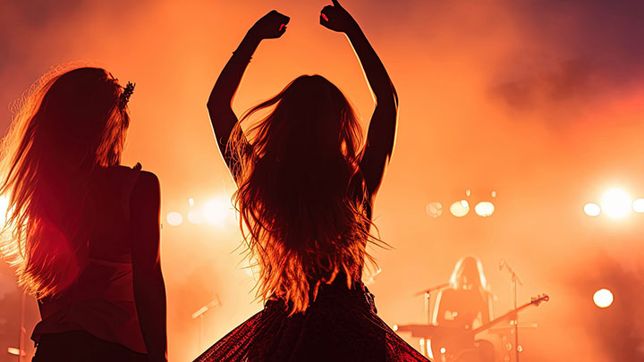 Name der Datei: Two girls having fun dancing at a summer music festival with a cheering crowd. silhouette concept